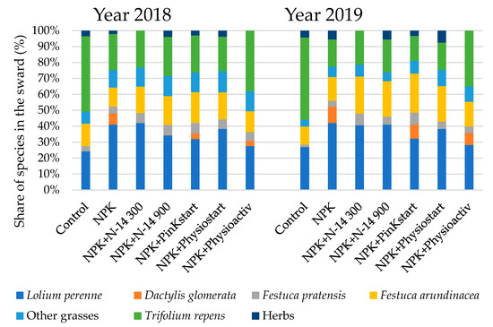 The share of this species at the other treatments ranged from 24.3–27.3% (control) to about 38% (NPK + Physiostart). Among the other grasses sown in this mixture, Festuca arundinacea had a significant share—in 2019 it was 24.6% at the plots fertilised with NPK + PinKstart. Festuca pratensis was less abundant—its share ranged from 1.3% (control) to 7.6% (NPK + PinKstart). The share of the other grass species sown in the mixture (Lolium westerwoldicum and Phleum pratense) amounted to only about a few per cent. Among the unsown, spontaneously occurring species in the sward, there was a relatively high share of Dactylis glomerata, which appeared in the sward fertilised with: NPK (7.0–10.3%), NPK + Physioactiv (3.3–7.3%), and NPK + PinKstart (3.3–8.6%). There were also other unsown grass species appearing spontaneously in the sward of most of the plots, Bromus inermis being the dominant species. Although grasses were dominant on the majority of treatments there were some treatments where Trifolium repens had a considerable share in the yielded biomass.