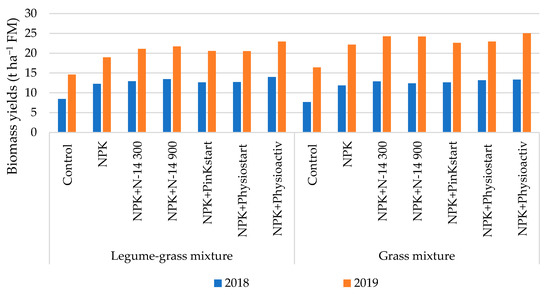 An impact of an applied fertilization on the biomass yields in both years of study was significant (Table 2). The effect of grass mixture on sward yield was proven only in 2019. First of all, very visible differences between years were observed (Figure 4). In the first year of study significantly the lowest yields (8.1 t∙ha−1 of FM) were stated on control plots. The average biomass yields for individual fertilization treatments were higher, ranged from 12.1 t∙ha−1 of FM to 13.7 t∙ha−1 of FM, but did not differ significantly. No significant effect of grass mixture was proved. Such extremely low biomass yielding in 2018 was due to weather conditions i.e., low amount of precipitation in the vegetation season. In the second year noticed yields on average exceeded the level of 20 t∙ha−1 of FM. Both type of plants mixtures and fertilization treatment significantly influenced the sward yielding. Biomass yielding of GM was significantly higher than LGM. Regardless of the mixture sward yields ranged from 15.5 t∙ha−1 of FM (control plots) to 24.0 t∙ha−1 of FM (NPK + Physioactiv).