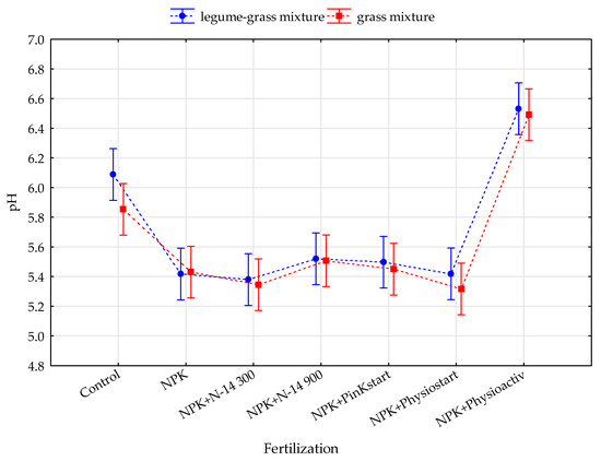 The average soil pH values for individual fertilization treatments ranged from 3.5 to 6.5 and were similar in both grass mixtures (Figure 5). The fertilization had a highly significant effect on soil pH, which was not proved for the type of sward (Table 3, Figure 4). The highest pH value (about 6.5) was noted in the treatment where the NPK + Physioactiv was used. The second highest pH value was stated in the control plot (pH ≈ 6.0). All the other fertilization treatments did not differ significantly in pH values, which ranged from 5.3 to 5.5.