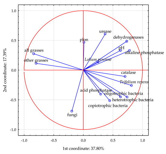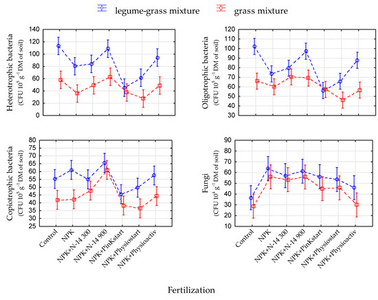 The fertilization treatments used in the experiment aimed to show whether the formula of biostimulants resulted in an increased soil biological activity compared to standard mineral NPK fertilization. As the botanical composition of sward has great influence on the function of the soil microbiome [59,60,61,62], the influence of the biostimulants on the populations of selected taxonomic and trophic groups of soil microorganisms and the soil enzymatic activity was analysed in two forage plants mixtures (GM and LGM) differing with share of functional groups of grasses and legumes.