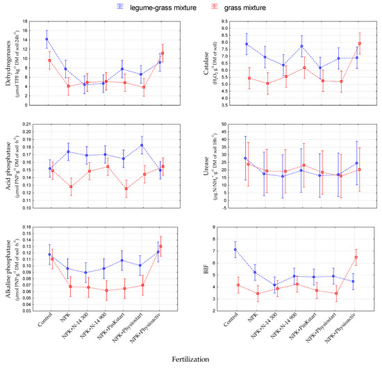 The alkaline phosphatase activity was much more unequivocal. In both mixtures it was the highest in the control and the NPK + Physioactiv treatment, where its level was very similar, i.e., about 0.12 µmol PNP∙g−1 DM of soil∙h−1. The differences between the plant mixtures were particularly noticeable in the other fertilization treatments. The alkaline phosphatase activity in these treatments was close to the highest values in LGM, whereas in the GM it was much lower—below 0.07 μmol PNP∙g−1 DM of soil∙h−1.