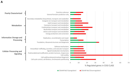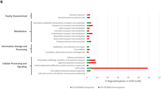 COG-based functional classification of genes regulated (>50× mean coverage and a minimum of 2-fold change) upon salt (A) or PEG8000 (B) treatments. The horizontal bars represent the % of genes regulated in the corresponding COG Class and, for each bar, the relative proportion of genes that are up- or down-regulated is shown in green and red, respectively. The COG class description and processes to which they belong are shown on the left of graphs.