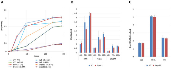 LMR001 and ∆rpoE2 were grown at 28 °C in TY broth with shaking at 180 RPM to an OD (600 nm) of 0.7. After incubation, cells were pelleted, washed twice with sterile water, and resuspended in 10 volumes of sterile water. Swimming test assays were performed using 20 mL of TY media that were complemented either with 0, 5.85, or 11.7 g·L−1 NaCl (generating, respectively, ≈0, 0.1, and 0.25 M final NaCl concentrations) and 0.2% agar. Each medium was poured into Petri dishes, upon cooling to 50 °C in a water bath to avoid water loss by evaporation, and allowed to solidify in a horizontal laminar flow for 15 min. Finally, aliquots (5 µL) of washed cells were gently dispensed into the center of the plates and incubated at 28 °C for 5 days and the diameters of motile bacteria were measured after 2, 3, and 5 days of growth. The average diameter and the standard deviations from three biological replicates were calculated.