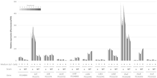 We further explored the involvement of the extra cytoplasmic function sigma factor in the transcriptional regulation of genes involved in the inositol catabolism (iolC and iolR), methionine cycle regulation (nesR and sahR), trehalose transport, and metabolism (thuR, thuE, otsB, and treZ) including a glycosyl transferase (PEG4866) located upstream of the otsBA operon in reverse orientation or in the regulation of the GSR (rsiA1, rsiB1). Their promoter regions were fused in front of the reporter gene encoding GFP in a mobilizable vector, and resulting constructions were further transferred into LMR001 and ΔrpoE2. Both strains containing the pPROBE derivatives were then grown either in TY medium or in TY complemented with NaCl at a final concentration of 250 mM in 96-microtiter plates and fluorescence with the optical density (600 nm) and were recorded every half hour.