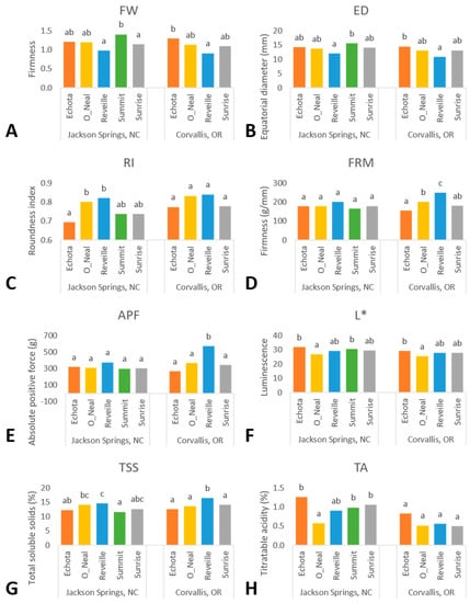 Genotypic means of phenotypic traits including fruit weight (FW) (A), equatorial diameter (ED) (B), roundness index (RI) (C), firmness (FRM) (D), absolute positive force (APF) (E), luminescence (L*) (F), total soluble solids (TSS) (G), and titratable acidity (TA) (H) evaluated within environments Corvallis and Jackson Springs using models 1 and 2 in PROC GLIMMIX (SAS v9.4). Means between genotypes followed by the same letter within an environment are not significantly different using the least squares means (LSMEANS) Tukey HSD multiple comparisons procedure (p < 0.05). ‘Summit’ was excluded in Corvallis statistical analysis due to the unbalanced harvests in Year 2.