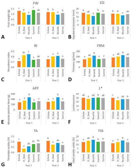 Genotypic means of phenotypic traits including fruit weight (FW) (A), equatorial diameter (ED) (B), roundness index (RI) (C), firmness (FRM) (D), absolute positive force (APF) (E), luminescence (L*) (F), total soluble solids (TSS) (G), and titratable acidity (TA) (H) evaluated within years, 2019 and 2020 using models 1 and 2 in PROC GLIMMIX (SAS v9.4). Means between genotypes followed by the same letter within a year are not significantly different using the least squares means (LSMEANS) Tukey HSD multiple comparisons procedure (p < 0.05). ‘Summit’ was excluded in Year 2 statistical analysis due to the unbalanced harvests in Corvallis.