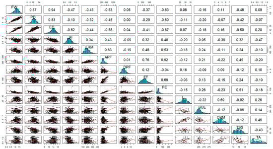 Further, we identified twenty-six moderately correlated phenotypic traits (|0.70|> |r| >|0.40|). Of the identified moderately correlated traits, ten were positively correlated, including RI-APF (r = 0.43), FRM-APF (r = 0.63), FRM-FT (r = 0.48), RI-FE (r = 0.40), FRM-FE (r = 0.53), FT-FE (r = 0.69), L*-CRM (r = 0.69), APF-TSS (r = 0.45), FE-TSS (r = 0.51), and CRM-TA (r = 0.46). The sixteen traits with a moderate negative moderate correlation included FW-RI (r = −0.47), ED-RI (r = −0.62), FW-FRM (r = −0.43), ED-FRM (r = −0.44), FW-APF (r = −0.50), PD-APF (r = −0.45), ED-APF (r = −0.58), ED-FT (r = −0.41), FW-FE (r = −0.63), PD-FE (r = −0.60), ED-FE (r = −0.67), FW-TSS (r = −0.48), PD-TSS (r = −0.42), ED-TSS (r = −0.50), RI-TA (r = −0.47), and TSS-TA (r = −0.43) (Figure 3).