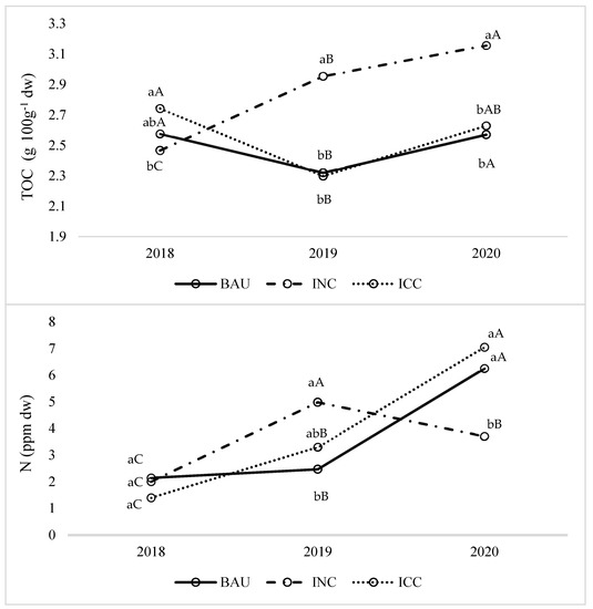 Soil total organic carbon (TOC) and total nitrogen (N) variability among the different system management during the three years. Legend: Values belonging the same parameters without common letters are statistically different according to Kruskal Wallis test (p < 0.05). Upper case letters refer to differences among years for each treatment; lower case letters refer to differences among treatments within the same year.