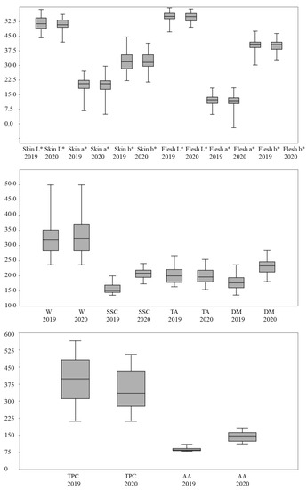 Box plots of CIELab coordinates of skin and flesh (Skin L*, Skin a*, Skin b*, Flesh L*, Flesh a*, and Flesh b*); W = weight (g), SSC = soluble solids content (g 100 g−1 FW), TA= titratable acidity (g MA 100 g−1 FW), DM = dry matter (g 100 g−1 FW), TPC= total phenolic content (mg GAE 100 g−1 FW), and AA = antioxidant activity (μg TE 10 g−1 FW) per year.