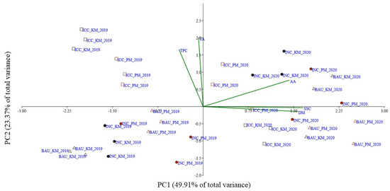 Biplot of Principal Component Analysis (PCA) performed on the two apricot cultivars (i.e., Kioto* KM and Pieve* PM), with three different system management systems (Business As Usual = BAU Innovative diversified system with Natural cover and Compost use = INC; Innovative diversified system with introduced Cover and Compost use = ICC), during 2019–2020. Legend: SSC = solid soluble content; TA = titratable acidity; DM = dry matter, TPC = total phenolic content; AA = antioxidant activity.