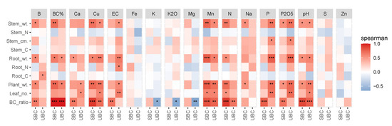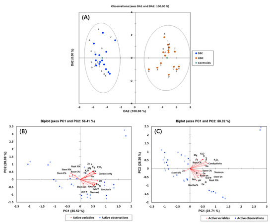All results were present as average values. Spearman correlation, discriminant analysis (DA), and principal component analysis (PCA) were performed to evaluate the relationships between the physicochemical properties of soil and BC mixtures (i.e., pH, growth, conductivity, element compositions) and the loaded ratios of SBC and UBC using Minitab 16 Statistical Software (Minitab Inc., State College, PA, USA) and XLSTAT software (Addinsoft, New York, NY, USA). Statistical significance was set as p ≤ 0.05, 0.01, and 0.001.