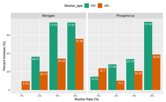 Principal component analysis of SBC- and UBC-treated soil showed that all physicochemical properties were positively correlated with the high BC rates and variation observed among SBC loading rates were less prominent than those observed in UBC (Figure 1B,C). We measured the N and P concentration at 10 weeks in each pot receiving BC. The percent increase in N and P concentrations at 2, 4 and 8% BC rates compared to the control pots were relatively higher in SBC than UBC (Figure 2).