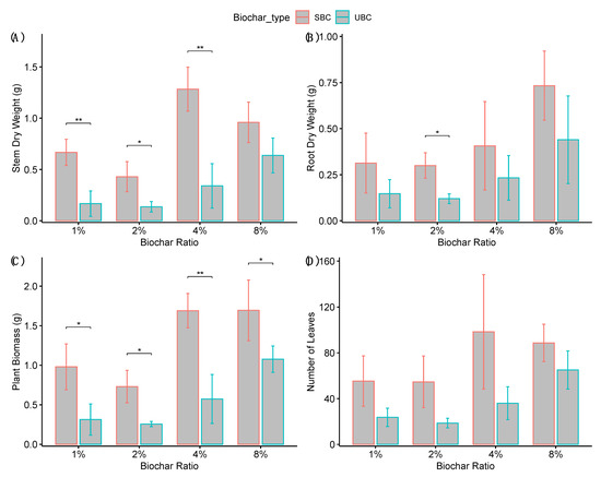 Soil amendments with SBC and UBC led to overall increase in the growth of the Bermuda grass (Figure S2). The addition of SBC to soil at 1 to 4% resulted in enhanced stem dry weight (Figure 4A): SBC at 1% (p < 0.01), 2% (p < 0.05) and 4% (p < 0.01). Compared with the SBC-amended soil, the plant in the UBC-amended soil had lower stem dry weight. On the other hand, the root dry weight in the SBC and UBC-amended soil increased along with the loading rates (Figure 4B). However, only the BC loading rate of 2% (p < 0.05) had clear differences in root dry weight from those in the SBC and UBC-amended soil. Overall plant biomass (stem and herbage dry weight combined) increased (p < 0.05) in SBC-treated soil compared to UBC-treated soil at all BC rates (Figure 4C). However, comparison of plant biomass between BC rates showed greater biomass only at 8% rates in UBC, whereas both 4 and 8% showed increases in pots receiving SBC (Figure S3C). On the other hand, adding 8% BC increased (p < 0.05) number of leaves (Figures S3D and S4D). No differences were observed in number of leaves among SBC-treated soil at all BC rates (p > 0.05). Therefore, the application of SBC at 1 to 8% to soil enhanced plant growth, while only application of UBC at 8% led to a clear positive effect on the plant growth. These results implied that the loading rates of UBC and SBC also influenced the growth of Bermudagrass during the pot experiment.