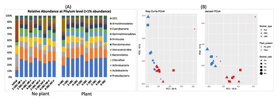 There were 12 phyla with more than 1% cumulative relative abundance shared among all samples. Proteobacteria was the most abundant phylum in all samples except for initial and 0% UBC, followed by Acidobacteria, Actinobacteria, Chloroflexi and Bacteroidetes (Figure 5A). However, in initial soil, Firmicutes, Actinobacteria, Chloroflexi and Proteobacteria were the most abundant phyla in the given orders. LEfSe analysis showed 15 differentially abundant features (LDA > 2) between SBC and UBC in plant samples. Alpha-proteobacteria (LDA = 3.3, p = 0.02) were more abundant in UBC, whereas Nitrospirae (LDA = 2.48, p = 0.02) and Firmicutes (LDA = 2.98, p = 0.02) were more abundant in soil receiving SBC (Figure S5). Similarly, after 10 weeks, no-plant soils with BC, showed an increased abundance of many photosynthetic genera such as Rhodopila, Rhodobacter, Oscillatoria, Planktothrix, Pseudanabaena, Nodosilinea, Phormidium, and N-fixing genera such as Mesorhizobium, Devosia genera were abundant in BC amended soil (Figure S6).