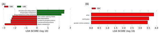 We predicted functional potential of microbial communities using PICRUst2 and FAPROTAX. OTUs with NSTI > 2 were not included for PICRUSt2 prediction, which increases the accuracy of predicted function [35]. After 10 weeks, KEGG pathway showed increases in photosynthesis and related functions in soil amended with BC (Figure S7B). The result is further confirmed by abundance of FAPROTAX-predicted phototrophy and photoautotrophy in the final sample (Figure S7A). Similarly, oxidative phosphorylation and biotin metabolism were greater in SBC than UBC-treat soils (Figure 6A). FAPROTAX identified more abundant nitrification and aerobic nitrite oxidation in soils receiving SBC (Figure 6B).