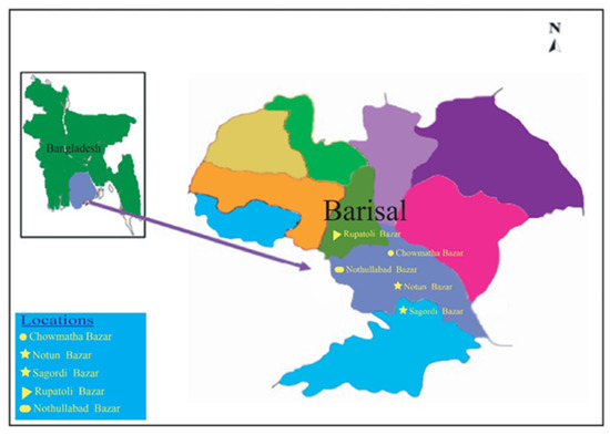 Map showing different sampling locations in the Barishal district, Bangladesh.