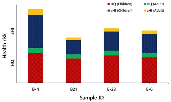 The human health risk associated with pesticide residues in country bean and eggplant samples were assessed based on the aHI and HQ, and are represented in Table 3 and Figure 2. The acute and chronic health risks of pesticides were calculated only for those samples that contained residues above or close to the EU-MRL. The calculated aHI values of acetamiprid and cypermethrin in both of the analyzed vegetables for adults and children ranged from 0.430–0.997 and 2.581–5.980, respectively (Table 3). The calculated aHI values of both pesticides for adults did not exceed 100% of the aRfD, indicating a negligible acute or short-term health risk via the consumption of pesticide-contaminated vegetables. In contrast, the assessed aHI values for children showed the potential threat to their health, as the values significantly exceeded the acceptable limit, while acetamiprid (aHI = 5.980) showed a higher risk factor compared with cypermethrin (aHI = 2.581).
