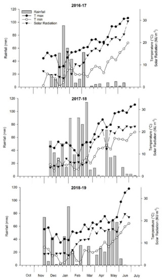 Figure 1 illustrates the variation in climatic parameters over years. Seasonal precipitation ranged from 388 to 810 mm in the first and third growth seasons, respectively, while in the second year, 770 mm was recorded. Gibbs and Maher [37] classified, using their decile index (DI), the second and third growing seasons as normal (DI = 9 and 9, respectively) and the first season as weak dry (DI = 4).