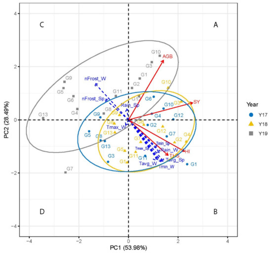 The WAASBY index [23] that provides for the weighting between mean performance (i.e., SY) and stability (WAASB) of individual traits was then computed.