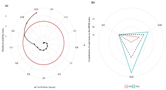 Figure 5b depicts the strengths and weaknesses view of the stable accessions identified across three consecutive growing seasons. The factors that contributed the most were placed towards the center, while those that contributed less were drawn near the plot edge. The strengths and weaknesses of accessions showed that the first factor (FA1) had the highest contribution for accessions G2 and G10, while FA2 had the highest contribution for accession G12. The weakness of G12, however, is related to FA1.