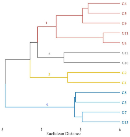 Due to the similar responses of the five lentil accessions (G4, G5, G6, G9, and G11) to seed quality parameters, they were bunched together in a single cluster: Group 1. G10 and G12 were two lentil accessions included in Group 2. Group 3 included two lentil accessions, G1 and G2. Group 4 clustered four lentil accessions together, including G3, G7, G8, and G13 (Figure 6).