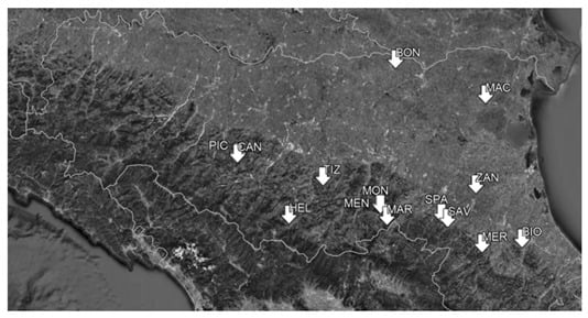 | Predappio Marly arenaceous formation 13.2 °C–895 mm Haplic Cambisols | 347 | 24 | Grassed orchard (peach, 10 years) | 32T 735,848 mE 4,886,840 mN | MER1_2 |