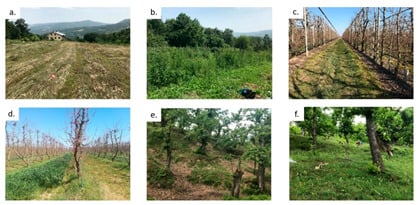 Representative images of the main land covers/uses typologies: (a) uncultivated grassland (HEL1), (b) raspberries (HEL3), (c) grassed orchards (pear, 18 yrs; ZAN1), (d) green manure (on the left) and grassed (on the right) orchards (peach, 10 yrs; BIO2 and BIO1, respectively), (e) chestnuts (MAR2), and (f) chestnuts (PIC4). The site codes are reported within the brackets (see Table A1).