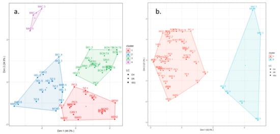 Figure 3a,b shows the clusters obtained in the PCA plots, where 69.2% and 73.8% of the variance was explained for topsoil and subsoil, respectively.