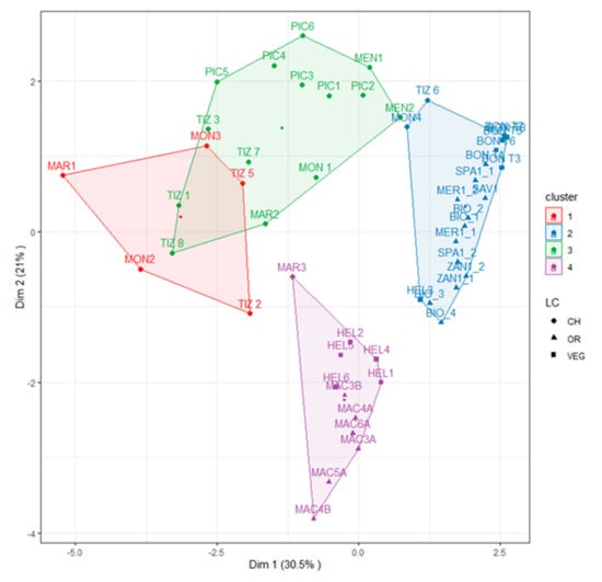 The cluster analysis performed on the SOM fractions allowed us to group the sites investigated into four groups. Plotting them according to PCA, 51.5% of the variance (Figure 4) was explained.