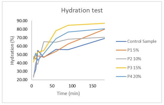 Hydration test (HT) was evaluated using a 1:20 ratio pasta: water, using the Schettino et al., 2021 [] method. Five grams of sample were placed in a glass containing 100 mL of water and placed in a thermostatic bath at 25 °C. Samples were removed after 5, 10, 15, 30, 60, 90, and 180 min of incubation and drained for 1 min and weighed. All samples were calculated in duplicate and expressed as (Equation (5)):