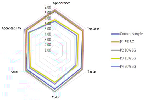 The sensory properties of cooked pasta are reported in Figure 4. Overall acceptability presented acceptable values with scores greater than 7 in all the range analyzed. The highest scores for all the sensory characteristics studied were registered for the sample with 10% spent grain addition. The appearance of the control sample had values close to the sample with the highest score, the P2 sample with 10% spent grain, while the sample with the highest addition of spent grain recorded the lowest score for appearance. The texture scores decreased with the increase in the content of spent grain, the panelists negatively appreciated the texture of the resulting pasta. Spinelli et al. [] shows a decrease of cooked dried pasta sensory overall quality plotted as a function of brewers’ spent grain concentration. With the addition of spent grain, the taste and the smell of pasta has changed, intensifying the taste of malt, but also the color of the pasta has changed, becoming darker, in according to Schettino et al. []. Polyphenols in spent grain can negatively affect the taste and smell of pasta, according to Iuga [].