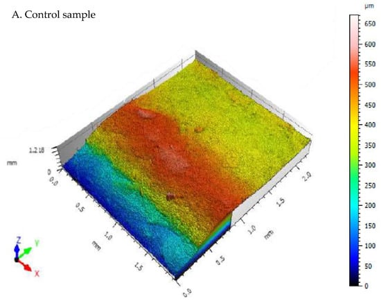 To determine the roughness and microstructure of the paste surface, a Mahr CWM100 microscope (Mahr, Gottingen, Germany) was used, and the images were processed using Mountain Map software 8 (digital Surf, Lavoisier, France) (trial version). The images were registered after scanning three different areas.