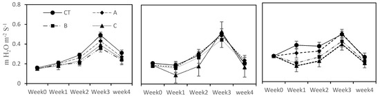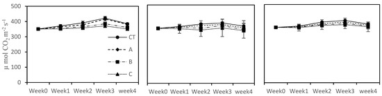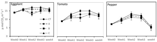 Pepper plant biomass showed the least significant difference among the three seawater applied treatments at the start and also at the end of the entire crop cycle (Figure 1A). In addition, no statistical difference was noted between the CT and other three seawater treatments, i.e., 5%, 10% and 20% SFW (Table 3). Similarly, A treatments (5% SFW) did not affect the growth and biomass of the eggplant, while B treatments (10% SFW) significantly reduced the growth and biomass in week 2 and week 4 as compared to control, and it was not significantly different from C treatments (20% SFW) at the time of harvesting (Figure 1A). The tomato growth and biomass were significantly affected by all three seawater treatments, i.e., 5%, 10% and 20% SWF (Figure 1A, Table 3).