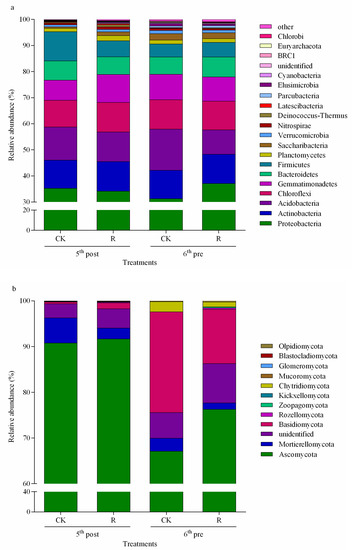 The microbial communities and the relative abundances of microbial phyla ((a) for bacteria, (b) for fungi). CK, the non-vegetable residue treatment; R, the vegetable residue treatment; pre, the pre-returning stage; post, the post-returning stage; number 5 and 6, the times of in situ vegetable residue return.