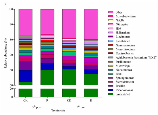 However, only some bacterial genera were significantly affected by continuous residue return. The relative abundance of Gemmatimonas, which belongs to Gemmatimonadetes, significantly increased at the 5th post-returning stage (CK: 0.69%, R: 1.14%; Figure 2a) and the 6th pre-returning stage (CK: 0.71%, R: 1.34%; Figure 2a) with the increased soil TN and AN content (Table 2). The relative abundance of Haliangium (CK: 0.63%, R: 0.98%; Figure 2a) also increased after residue return at the 5th post-returning stage, which was also known to have a positive correlation with the soil nutrient level [41]. The relative abundance of Bacillus (CK: 6.08%, R: 3.19%; Figure 2a), the main genus in Firmicutes, significantly decreased at the 5th post-returning stage, although the difference with CK disappeared at the 6th pre-returning stage.