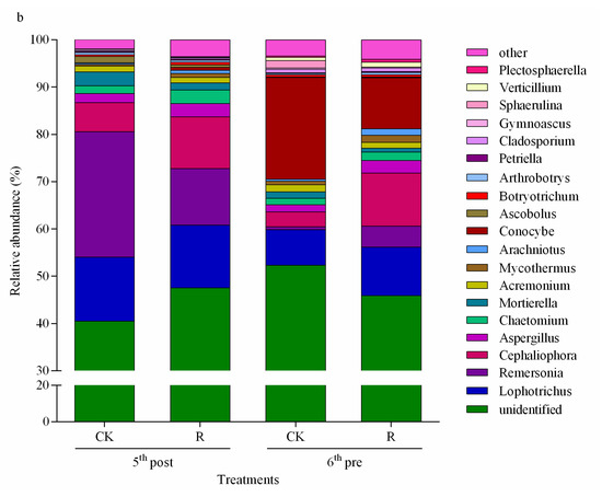 The microbial communities and the relative abundances of microbial genera ((a) for bacteria, (b) for fungi). CK, the non-vegetable residue treatment; R, the vegetable residue treatment; pre, the pre-returning stage; post, the post-returning stage; number 5 and 6, the times of in situ vegetable residue return.