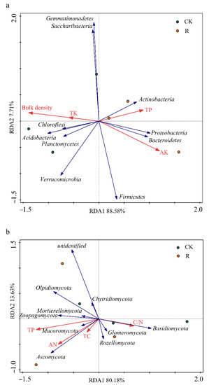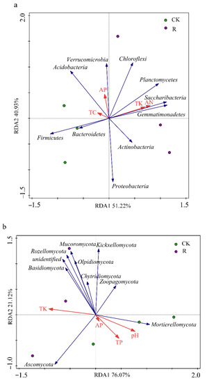 Redundancy analysis (RDA) between fungal communities and physicochemical characteristics at the 6th pre-returning stage ((a) for bacteria, (b) for fungi). CK, the non-vegetable residue treatment; R, the vegetable residue treatment.