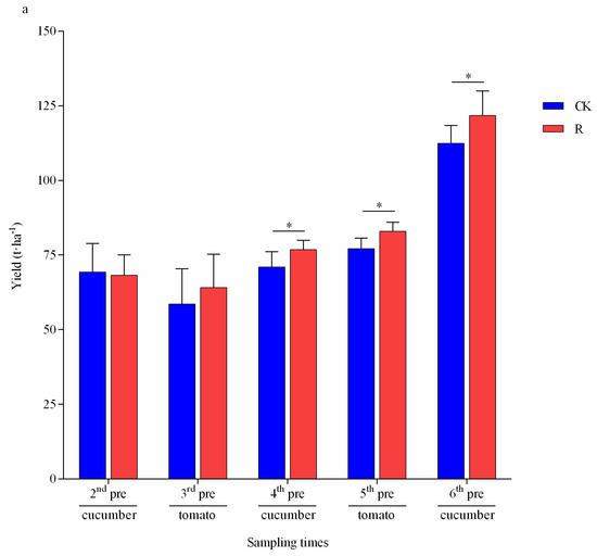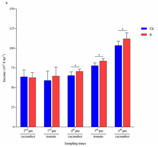 The fruit yield (a) and the income of fruit yield (b) after in situ vegetable residue return. CK, the non-vegetable residue treatment; R, the vegetable residue treatment; pre, the pre-returning stage; number from 2 to 6, the times of in situ vegetable residue return. Statistically significant differences were analysed between CK and R at each stage using t-test. *, p < 0.05. Vegetable from Shouguang holds a big market share in Beijing. The average sale prices of cucumber and tomato at the largest vegetable market in Beijing from 2017 to 2020 were approximately 0.92 USD·kg−1 and 1.01 USD·kg−1, respectively.
