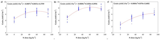 The effect of different N doses on spring barley grain yield (t ha−1) in (a) Caslav, (b) Ivanovice, (c) Lukavec. The data is interpolated by a quadratic model (red line).