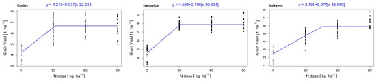 where GYT is grain yield recorded in the fertilizer treatment, GYC is grain yield recorded in the Control and N represents the dose of applied N. The linear-plateau model was calculated using the R software (R: A language and environment for statistical computing. R Foundation for Statistical Computing, Vienna, Austria, 2020), using three R packages [43,44,45].