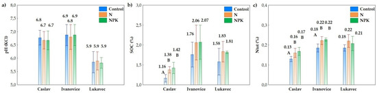 The effect of fertilizer treatments on soil (a) pH, (b) SOC (%), and (c) Ntot (%) in Caslav, Ivanovice and Lukavec (2013–2016). Mean values followed by the same letter are not statistically significantly different (p < 0.05). No letter means that no difference was recorded in the locality.