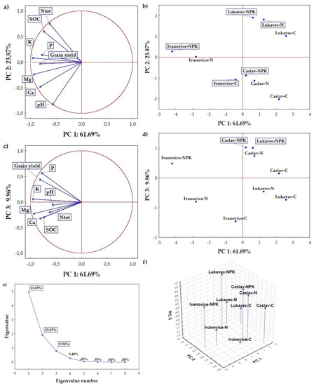 The results of the PCA, showing relationships between the analyzed soil parameters, grain yield and fertilizer treatment/locality. (a) PC1 and PC2—grain yield and soil properties, (b) PC1 and PC2—fertilizer treatments according to the locality, (c) PC1 and PC3—grain yield and soil properties, (d) PC1 and PC3—fertilizer treatments according to the locality, (e) eigenvalues, (f) 3D model showing PC1, PC2 and PC3 axis.