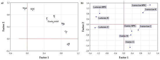 The results of the factor analysis showing the relationship between (a) soil properties and grain yield and (b) fertilizer treatment/locality.
