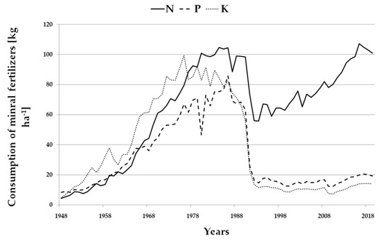 The mean consumption of mineral fertilizers (N, P, K, kg ha−1) in the Czech Republic (1948–2019).
