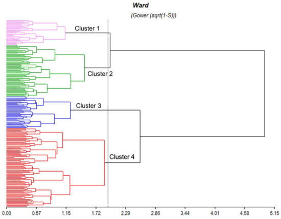 Dendrogram of 195 accessions of Manihot esculenta, indicating four groups of accessions based on quantitative morphological data using Ward’s method and Gower’s distance.