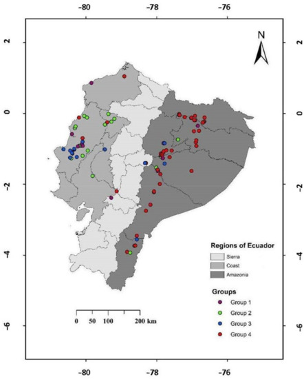 Group 2 presents 95 accessions (Table A1) mainly from provinces of the Coast region: Esmeraldas, Manabí, Santo Domingo, Los Ríos, Guayas, Cañar, and Azuay to more than seven accessions from the Amazonia province of Francisco De Orellana. Once again, the provinces of Cañar and Chimborazo are known as Sierra region (highlands). However, the collection sites in this region are from lowland areas (La Troncal) or foothills of the western mountain range (Cumandá), respectively.