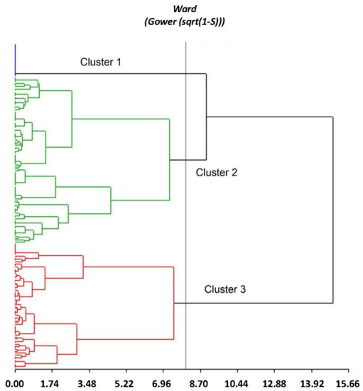 Dendrogram of the Ecuadorian cassava collection indicating three groups of accessions based on quantitative ecogeographic data using Ward’s method and Gower’s distance.