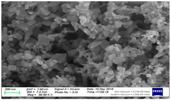 Two doses of three forms of Zn were prepared for foliar nourishment of Zn deficiency-stressed carrot plants. Zinc oxide nanoparticles were applied at 20 mg L−1 (ZnO-NPs(1)) and 40 mg L−1 (ZnO-NPs(2)), zinc–EDTA was applied at 1 g L−1 (Zn–EDTA(1)) and 2 g L−1 (Zn–EDTA(2)), and bulk zinc oxide was applied at 200 mg L−1 (ZnO-B(1)) and 400 mg L−1 (ZnO-B(2)). ZnO-NPs, Zn–EDTA, and ZnO-B were secured from Sigma-Aldrich, St. Louis, MO, USA. Plants were foliarly nourished with all spraying solutions three times; 28, 48, and 68 days after sowing (DaS) using a 20-L back sprayer. All plants (n = 140) in each plot were sprayed to runoff with 4.25, 5.10, and 6.80 L of spraying solution (e.g., 25, 30, and 40 mL plant−1) in the three spraying times, respectively. The description of all experimental treatments is offered in Table 3. ZnO-NPs were subjected to transmission electron microscopy (TEM), and the morphological structure of ZnO-NPs (≤100 nm) is illustrated in Figure 1.