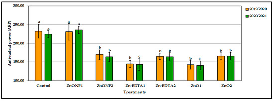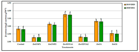 The results of the anti-radical power (ARP) and β-carotene in the root of carrot plants are shown in Figure 2 and Figure 3. The application of ZnO-NPs(1) did not affect ARP, but the other treatments significantly reduced ARP, and the largest values (233.0 vs. 224.8) were recorded with the control treatment. ZnO-B(1) treatment recorded the lowest values (142.3 vs. 140.5) with decreasing percentages of 38.9 vs. 37.5% compared to the control in both seasons, respectively. The maximum content of β-carotene (3.37 vs. 3.32) was obtained with ZnO-NPs(1) (20 mg L−1) and ZnO-B(1) (200 mg L−1) in the 2019/2020 and 2020/2021 seasons, respectively, while the lowest values (2.54 vs. 2.28) were recorded with ZnO-B(2) (400 mg L−1) and ZnO-NPs(2) (40 mg L−1) in both seasons, respectively. The increasing percentages reached 32.7 vs. 45.6% in both seasons, respectively, compared to the lowest ones.
