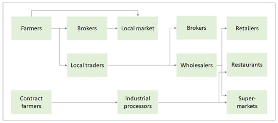 14]. The flows from the production areas to the cities are the largest in volume, where the following stakeholders are involved: farmer—local trader—wholesaler—retailer/restaurants/supermarkets—consumer. In the post-harvest part of this typical supply chain, transportation, food loss and food waste induce GHG emissions—cold storage is generally not used. However, the largest share of GHG emissions, as in most agricultural supply chains, occurs at the farm level (12.8%).